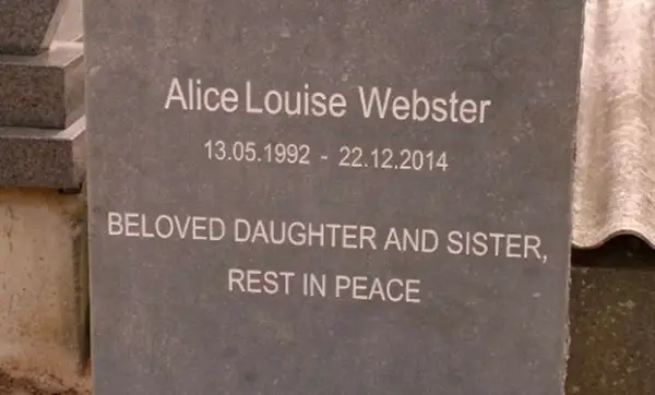 Nok en dødsdato, tydelig vist: 14. desember 2014. Litt over en uke før Alices død.