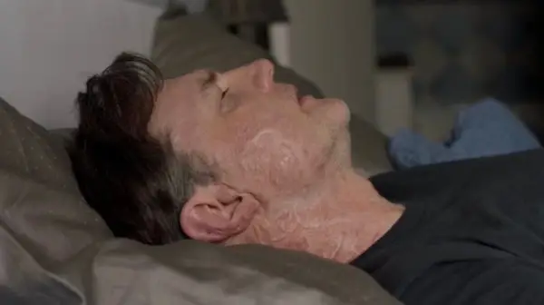 David Morrisseys karakter har noe som ser ut som en ganske ekkel forbrenning i ansiktet og ryggen i dag, men han har det ikke i scenene satt i 2014.